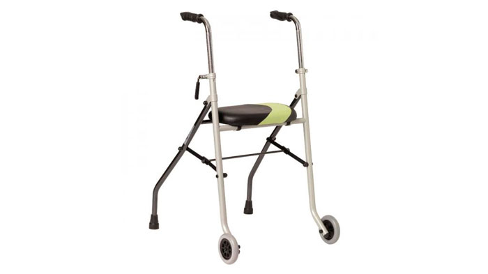 Andador con asiento plegable con dos ruedas delanteras de referencia. Muy ligero y con mejor maniobrabilidad gracias a la posición de las ruedas en el exterior del marco. Puños de forma anátomica ajustables en altura. Asiento acolchado, bicolor y cómodo.